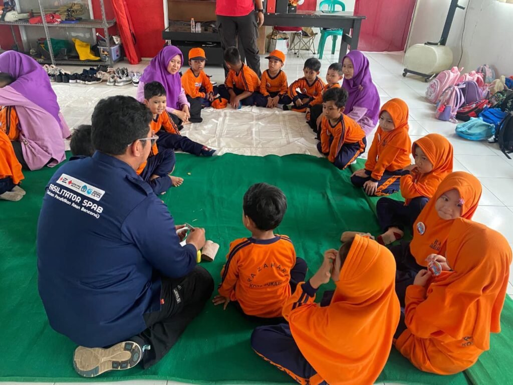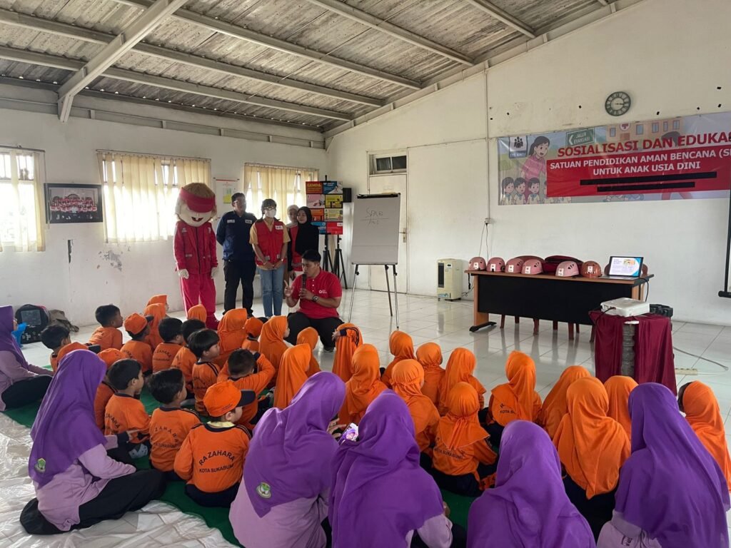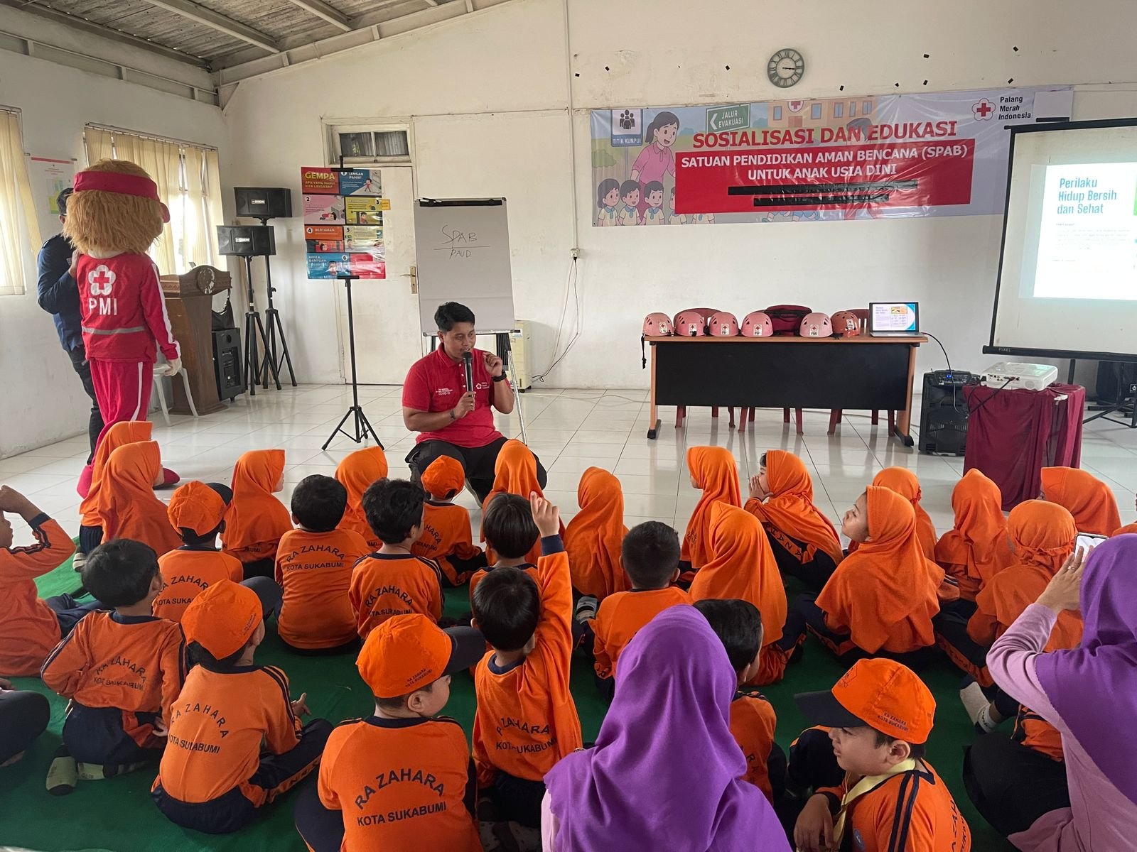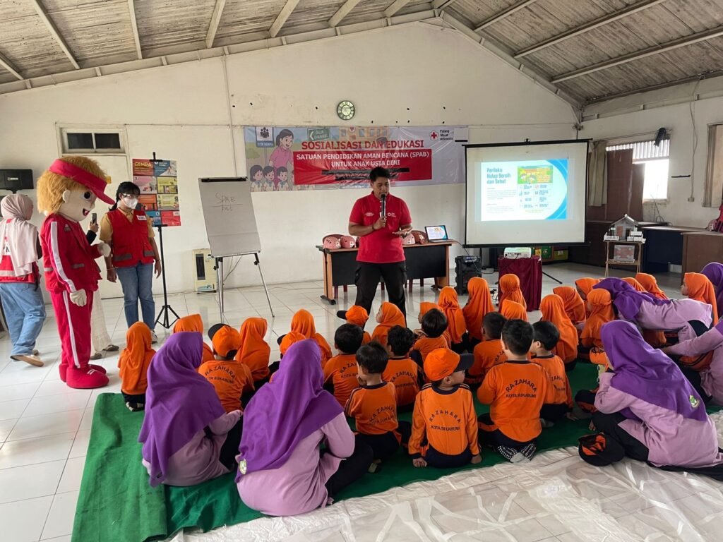 KOTA SUKABUMI- Suasana ceria terlihat sejak pagi ketika puluhan murid Raudhatul Athfal (RA) Zahara Kota Sukabumi melakukan kunjungan edukasi mengikuti kegiatan Sosialisasi dan Edukasi Satuan Pendidikan Aman Bencana (SPAB) di Markas PMI Kota Sukabumi. Dengan seragam oranye cerah, para siswa tampak antusias semangat dan ceria menyimak materi yang dibawakan para relawan PMI Kota Sukabumi