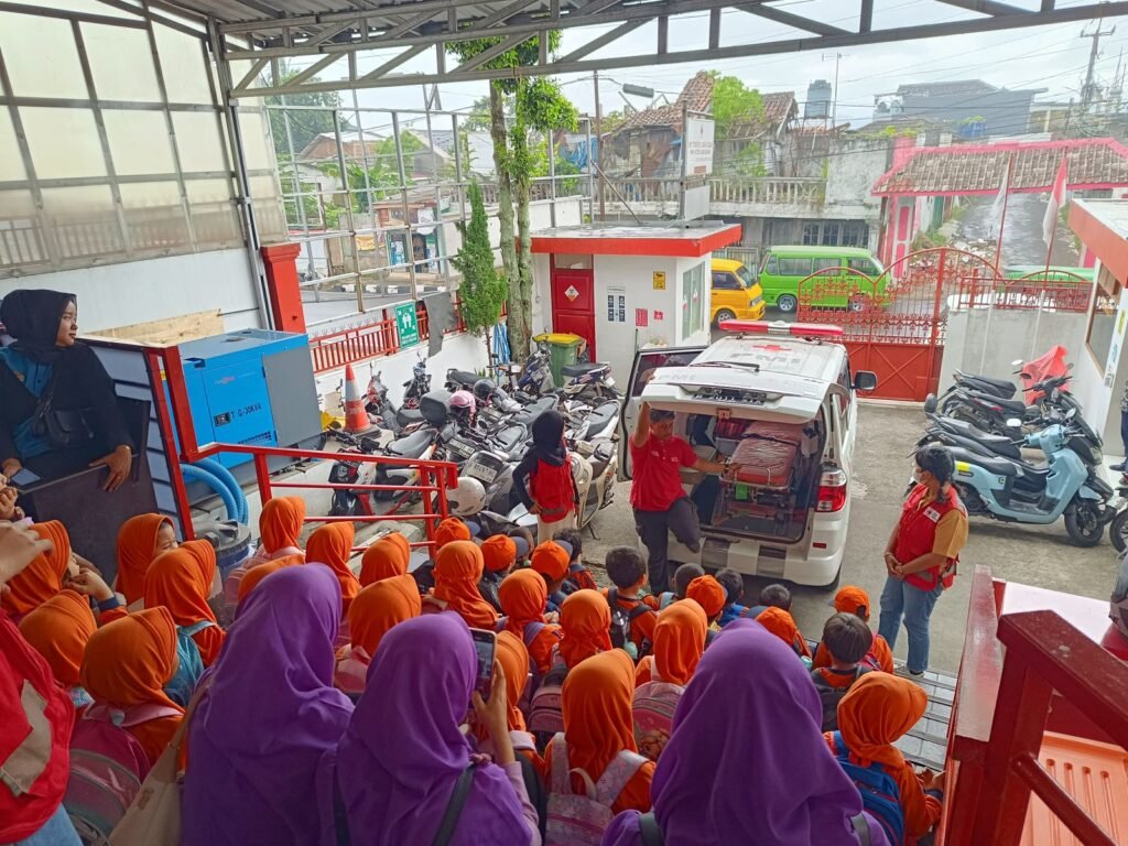 PMI juga memperkenalkan peta risiko bencana di sekolah, membantu anak-anak memahami area aman, titik kumpul, serta jalur evakuasi jika situasi darurat terjadi. Keseruan semakin terasa ketika anak-anak diajak melihat layanan kemanusiaan PMI, termasuk ambulans PMI yang bisa dimanfaatkan masyarakat secara gratis. Mereka tampak antusias melihat bagian dalam ambulans dan mendengarkan penjelasan tentang peralatan yang digunakan dalam penanganan darurat.