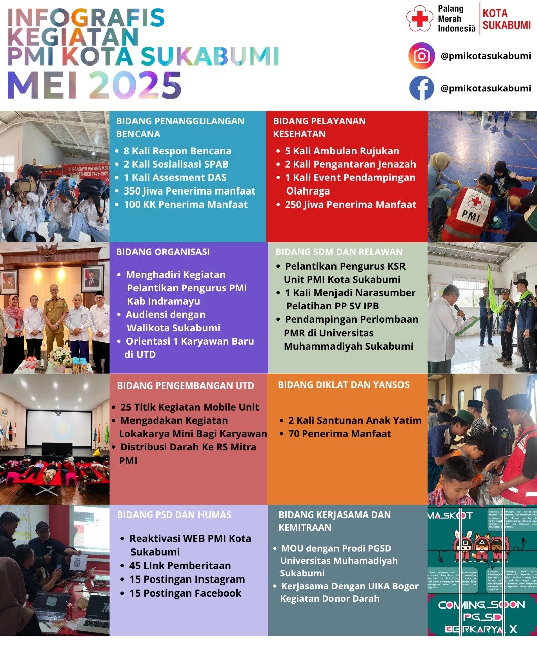 Berdasarkan data yang dihimpun dan disajikan melalui Infografis layanan dan kegiatan Program PMI Kota Sukabumi. Sepanjang bulan Mei 2025 mencatat berbagai kegiatan dan layanan ini diantaranya :