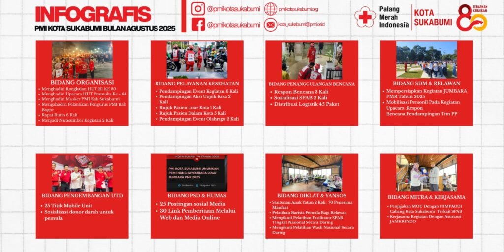 KOTA SUKABUMI– Palang Merah Indonesia (PMI) Kota Sukabumi merilis capaian kegiatan kemanusiaan yang telah dilaksanakan sepanjang bulan Agustus 2025. Melalui