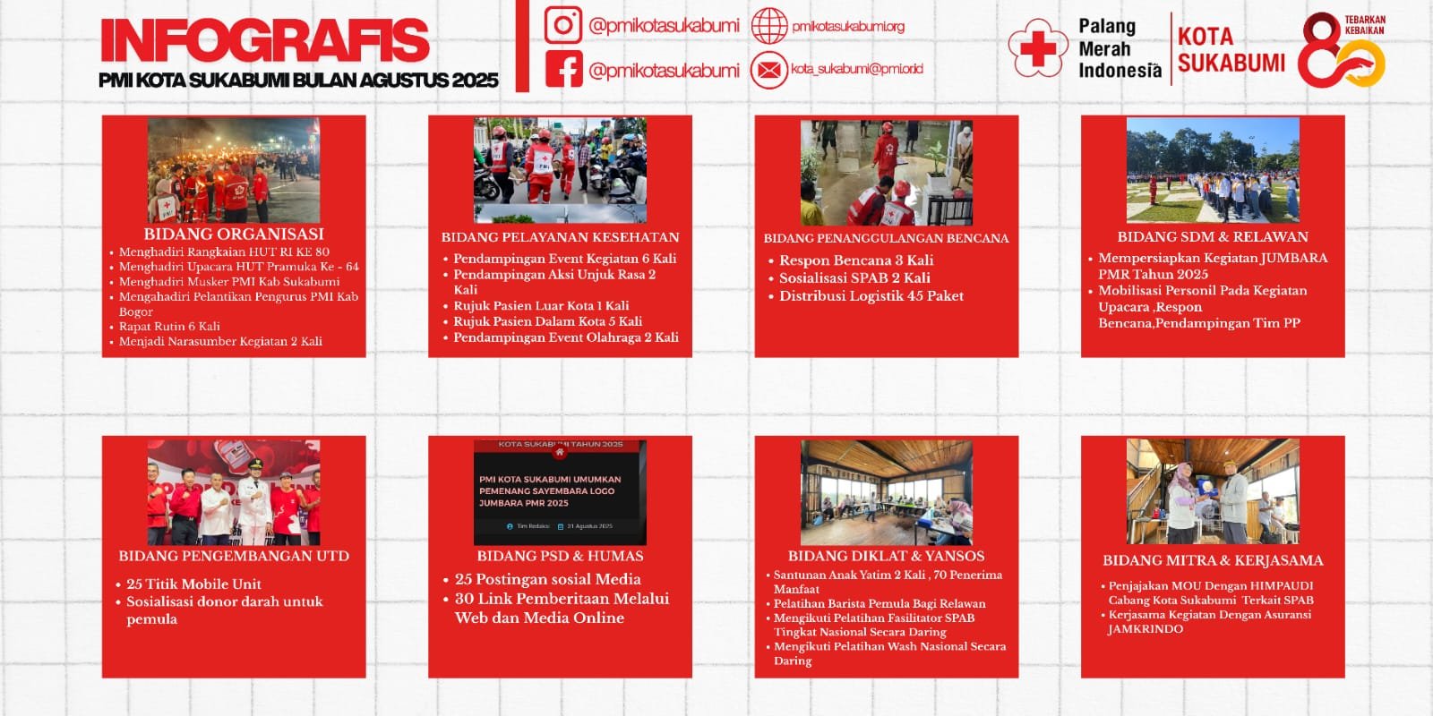 KOTA SUKABUMI– Palang Merah Indonesia (PMI) Kota Sukabumi merilis capaian kegiatan kemanusiaan yang telah dilaksanakan sepanjang bulan Agustus 2025. Melalui infografis resmi yang dipublikasikan, PMI mencatat berbagai aktivitas lintas bidang yang menunjukkan komitmen dalam memberikan pelayanan kepada masyarakat.