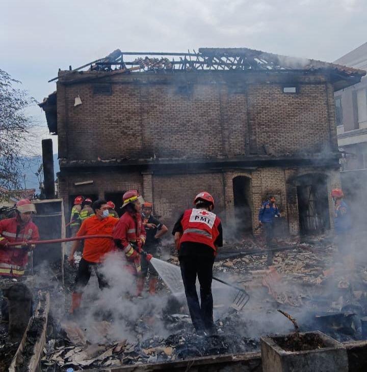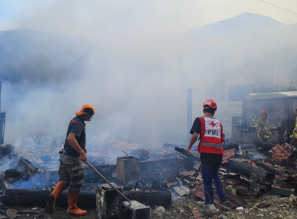 KOTA SUKABUMI — Palang Merah Indonesia (PMI) Kota Sukabumi menerjunkan personel Relawan untuk melakukan respon kedaruratan kebakaran yang melanda Rumah Makan Parantina di Jalur Lingkar Selatan, Kelurahan Sudajaya Hilir, Kecamatan Baros, Kota Sukabumi, Selasa (27/1/2026).